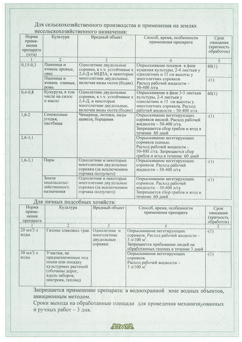 Препарат предназначен для уничтожения более 100 видов сорняков, таких как амброзия, вьюнок, бодяк, звездчатка, борщевик, марь и другие. Работает по однолетним и многолетним двудольным сорнякам. Применяется на участках, не предназначенных под посев или посадку культурных растений (обочины дорог, вдоль заборов, построек, теплиц).
