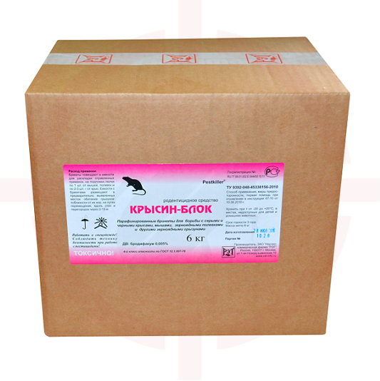 Крысин-блок - готовая родентицидная приманка в виде твёрдых парафиновых брикетов красного цвета на основе зерна или круп.