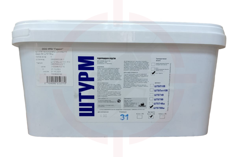 Штурм - готовая родентицидная приманка в виде мягких брикетов со вкусом шоколада. Такая форма приманки рекомендована специально для борьбы с крысами, так как крысы, в отличие от мышей, предпочитают не столько зерно, сколько разнообразный корм растительного и животного происхождения, а тесто-брикеты отвечают этим предпочтениям.