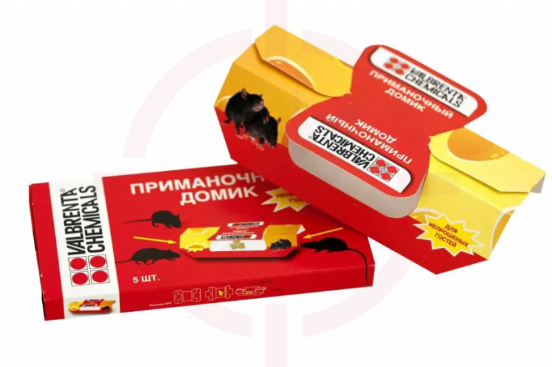 Для лучшего привлечения грызунов можно дополнительно положить в середину ловушки пищевую приманку (выпечка, колбаса, шоколад, крупы и т.д.). Учуяв лакомство, вредитель забежит в домик и надежно приклеится. Благодаря высокой вязкости клеевого состава, пытаясь выбраться, мышь еще сильнее увязает и умирает, лишенная доступа к жидкости.