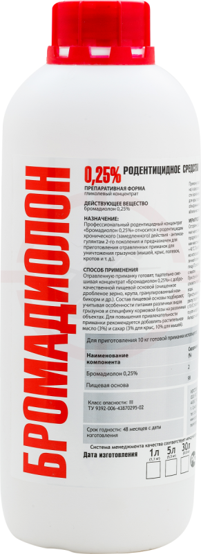 БРОМАДИОЛОН к. э. 5,5 л. – вязкая прозрачная жидкость красного цвета. Средство предназначено для приготовления отравляющих приманок, используемых в борьбе с мышами, водяными, серыми, чёрными крысами.