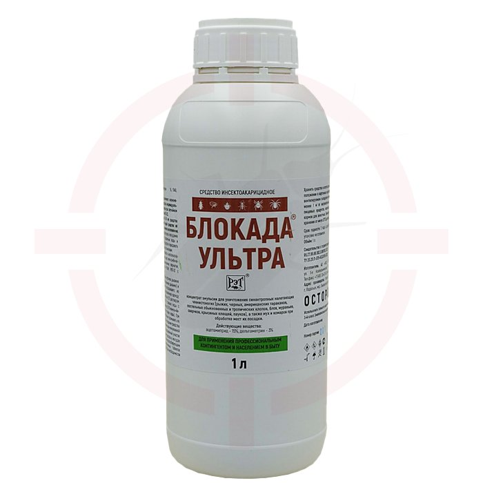 Блокада-ультра - профессиональное инсектицидное средство на основе ацетамиприда 15% и дельтаметрина 3%. Применяется против таких насекомых как клопы, тараканы, блохи, мухи, комары, муравьи, пауки, сверчки, крысиные клещи и т.д.
