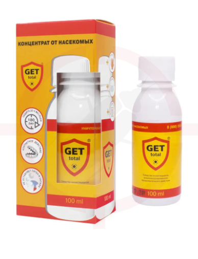 GET Total — микрокапсулированная суспензия на основе хлорпирифоса 5%. Уничтожает клопов, тараканов, муравьев, блох, ос, мух, кожеедов и других насекомых.
