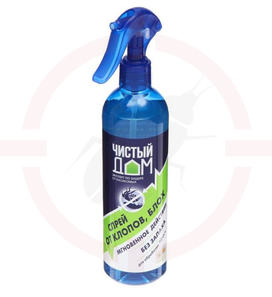 Спрей от насекомых «Чистый Дом» является готовым к применению средством борьбы с блохами, тараканами, клопами, муравьями, кожеедами и мухами (в местах их посадки). Содержит экстракт ромашки. Распыление препарата происходит с помощью ручного помпового распылителя, расположенного на крышке бутылки.