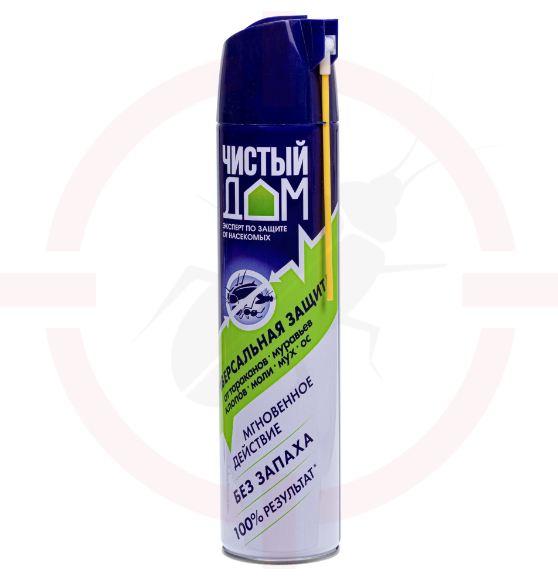 «Чистый Дом аэрозоль супер», обладает широким спектром инсекицидного действия, предназначено для уничтожения летающих и ползажщих насекомых.